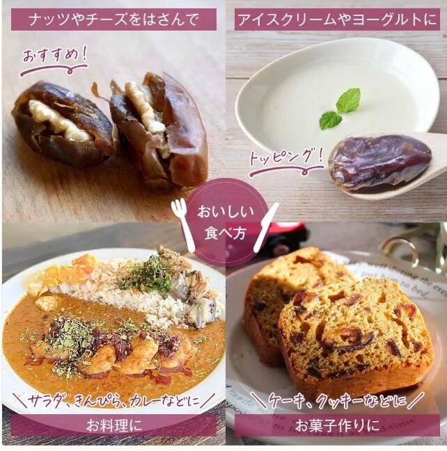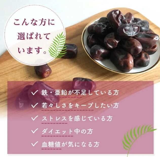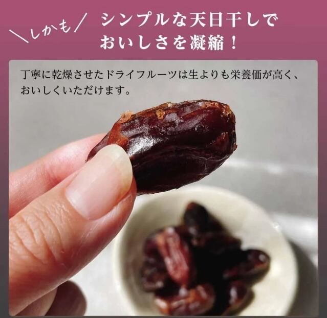 砂糖、添加物不使用。デーツ本来のふっくらとした口当たりと濃厚でコクのある自然の甘さをお楽しみください。