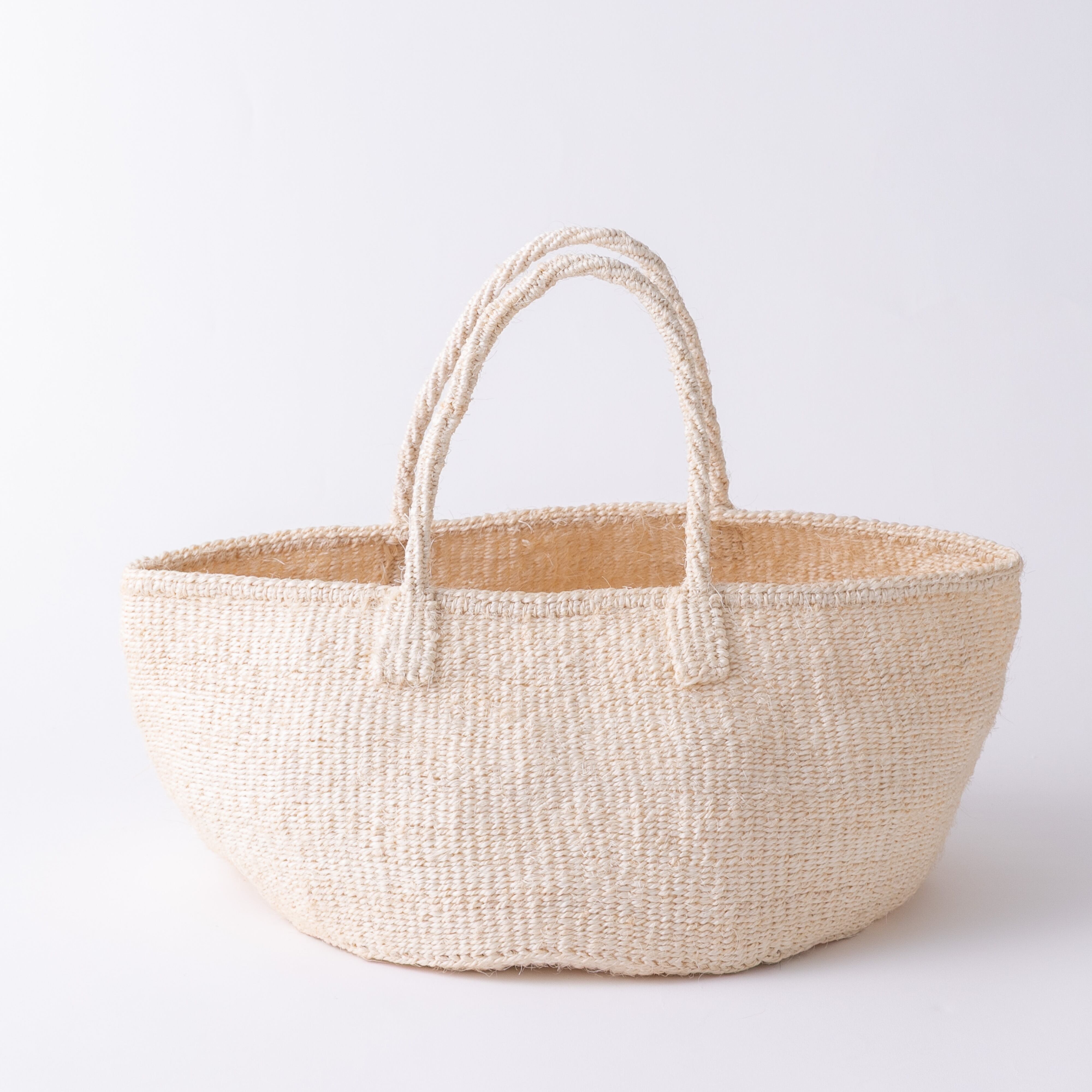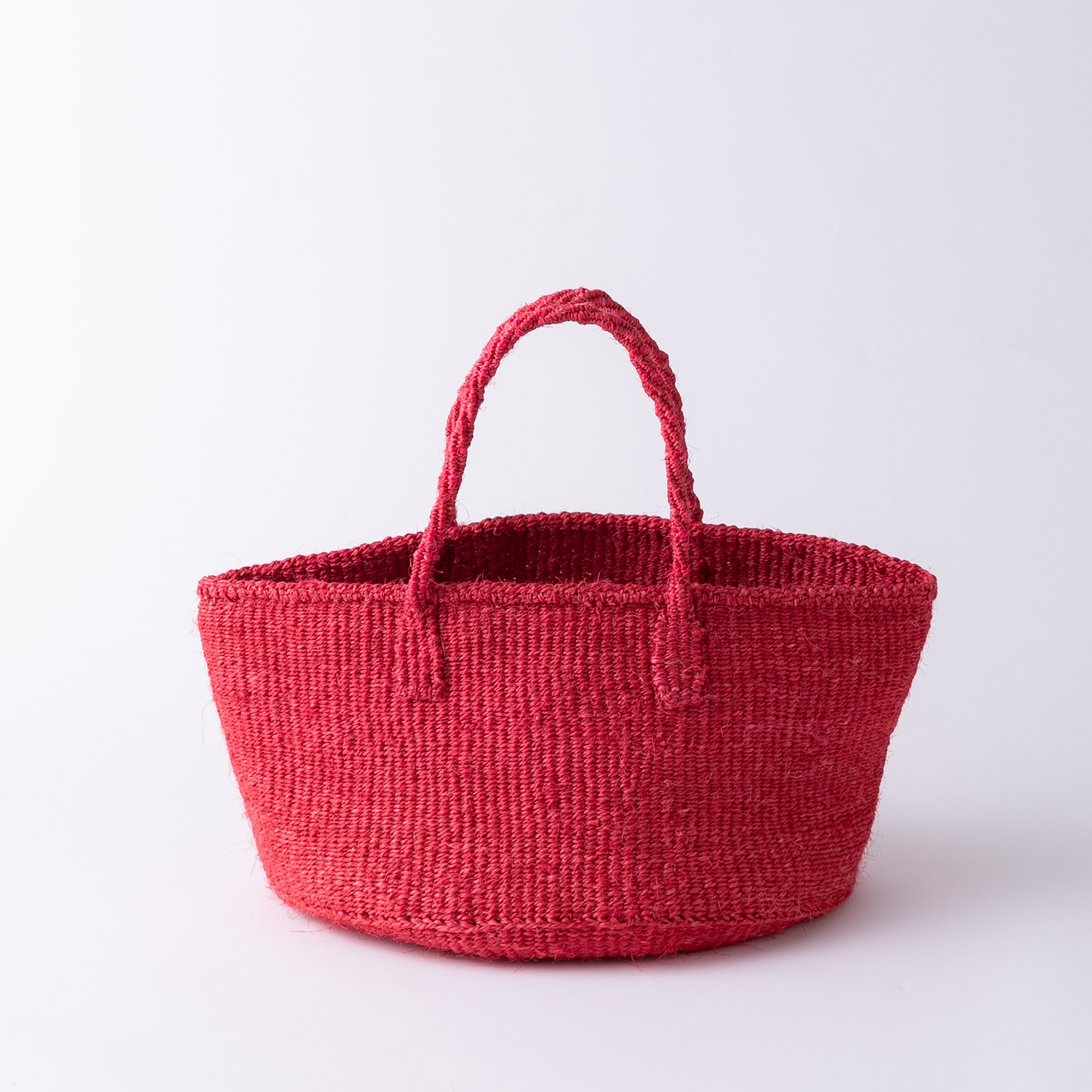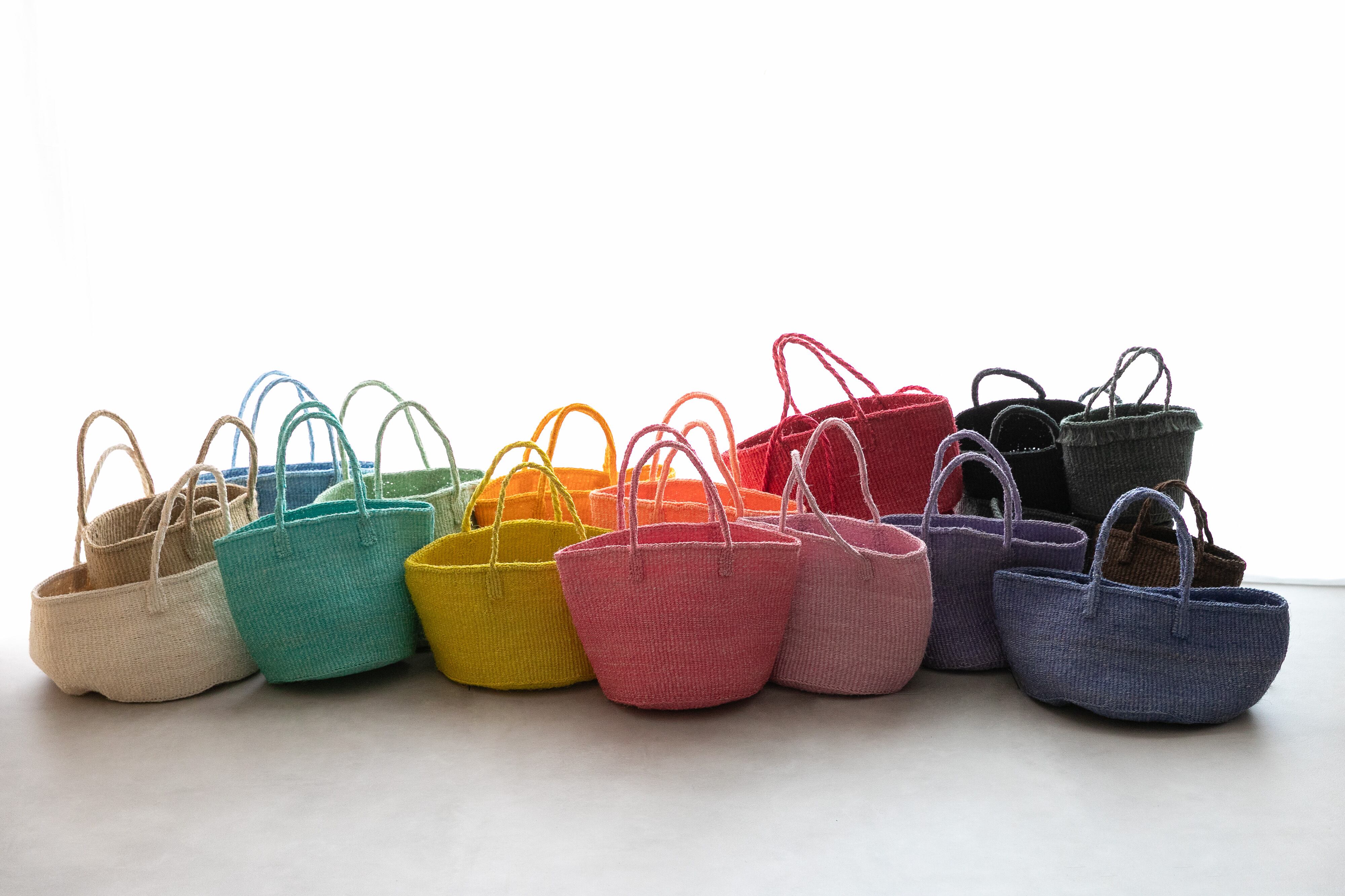 ケニアではサイザル麻で編むカゴ作りが盛んで、農村に住む女性たちによって手仕事として受け継がれてきました。サイザルバスケットは、サイザルの葉を刈り取って繊維をとりだし、糸に撚ってから染めたものを、乾かし、編んで作ります。日本ではサイザルバッグ、サイザルかごと呼ばれることもあります。